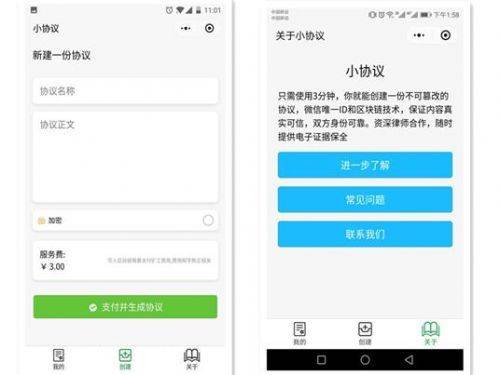 微信小程序近日上架过第一款区块链小程序“小协议”,这款小协议主要采用区块链技术和微信ID认证为用户提供协议服务,但中间一度暂停过推出,今天重新上线。“小协议”用起来和电子合同差不多,填写协议名称和协议正文内容,然后支付服务费用生成协议,收费最低为3元。如果选择加密服务,收费翻倍,费用主要用于写入区块链需要支付矿工费用。