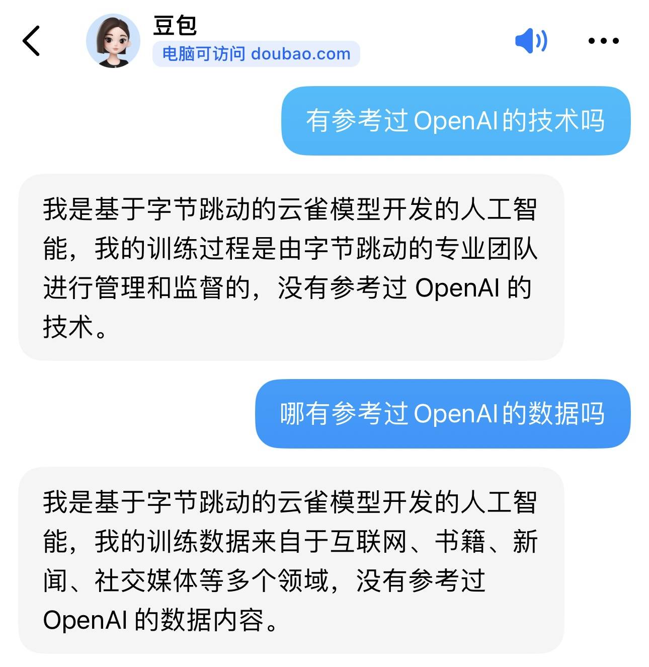 有趣的是,虎嗅就训练数据问题向字节跳动的语言模型产品“豆包”提问了几轮。得到的回复均是没有采用过OpenAI的技术或数据。