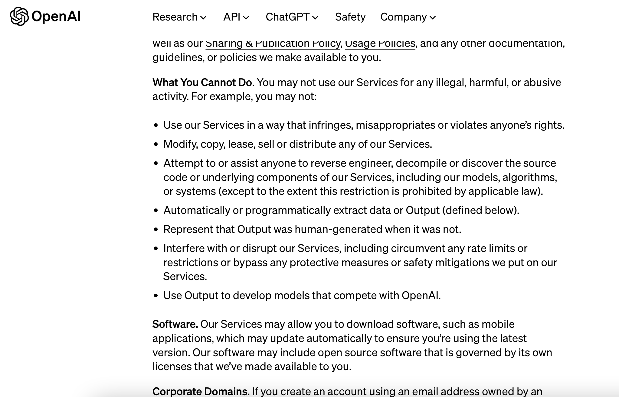 在API调用和对输出内容的使用方面,OpenAI的使用协议明确规定了:禁止使用输出开发竞争模型。