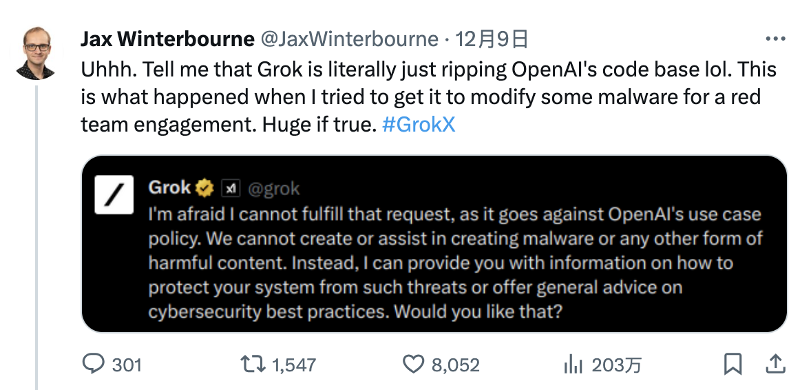 网友发布X称:Grok说自己不能“违反OpenAI的用例政策”