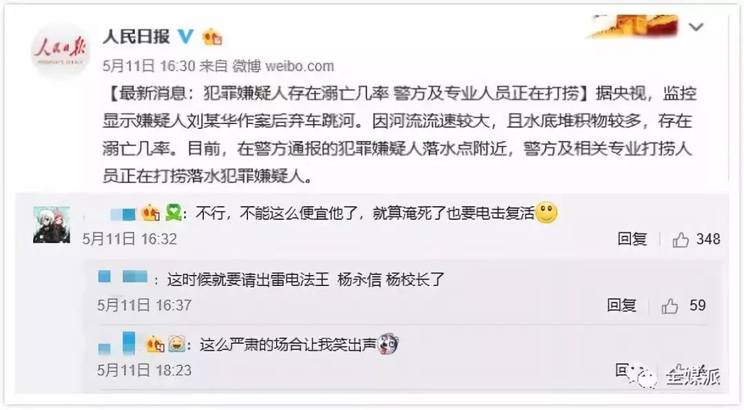 在媒体曝出犯罪嫌疑人有可能溺亡时,又有一股声音莫名地开启了戏谑化的调侃模式。