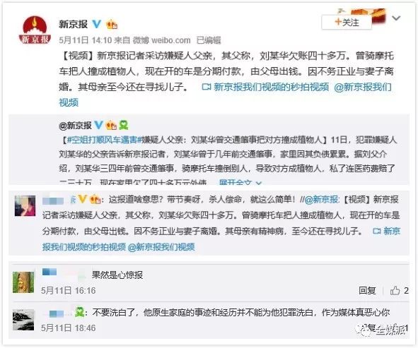 5月11日,二更食堂公号推出了头条文章《托你们的福,那个杀害空姐的司机,正躺在家里数钱》。文章以煽情的手法脑补臆想了受害者遇害场面。