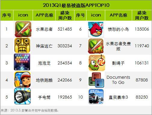 2013年Q1最易被盗版的安卓APP 多为知名游戏,如水果忍者、神庙逃亡、泡泡龙等,用户下载APP时应尽可能下载已通过正版认证的软件,以防盗版手机病毒侵害。