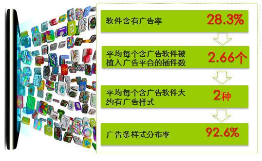 在安管云开放平台检测软件中,28.3%的软件含有广告,平均每个广告软件被植入2.66个广告平台的插件,平均每个含广告软件大约有2种广告样式。其中,广告条是目前移动端主要的广告样式,占比92.6%。