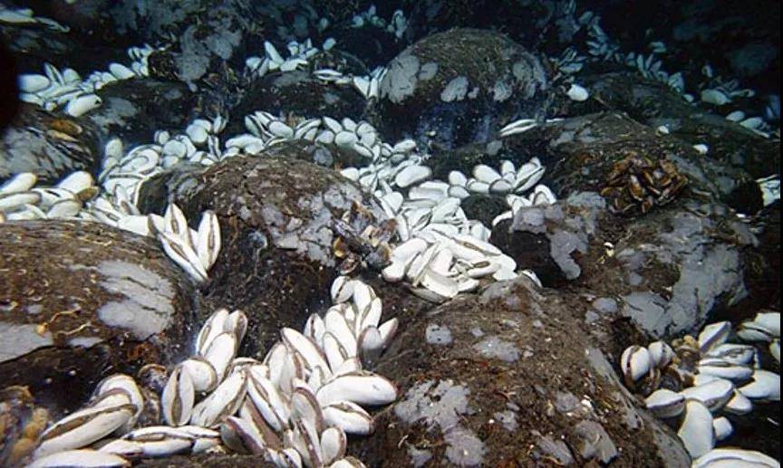 这就带来了一个大发现,海底不仅有黑烟囱,还有热液生物群。
