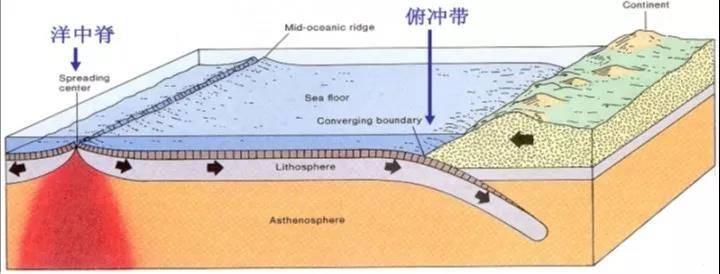 随着不断地涌出,先形成的洋壳被推往两侧,最终到达大陆的边缘,沿着俯冲带消失下去。因为大陆岩石圈的比重较轻,而大洋的岩石圈较重,所以到了俯冲带,大洋板块就俯冲在大陆板块之下消失了。