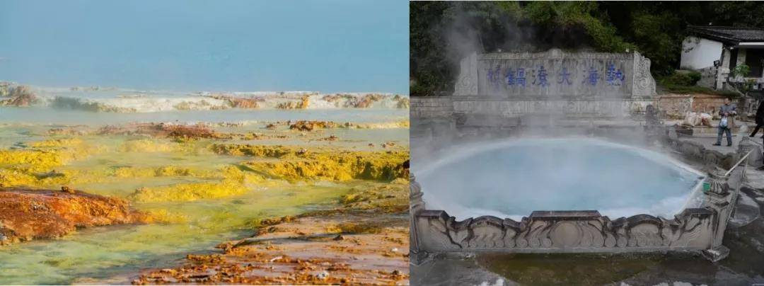 这是美国的黄石公园,右边是我们国家云南腾冲的热泉。在这两个热泉里面,科学家都发现了大量的嗜热微生物。美国黄石公园在这方面研究得比较详细,在60度70度这样的温度范围里面都有不一样的微生物的发现。