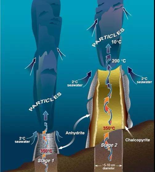 当海水沿着中央大洋裂谷渗透到海底深处,最深可达五六公里,冰凉的海水、热液、地下地幔物质的岩浆搅合在一起,带着大量硫化物,比如硫化铜、硫化锌、硫化铅到达海底表面,与海水再次结合发生沉淀、堆积,形成黑烟囱。黑烟囱有时候生长很快,可以达到每天30厘米。这就是黑烟囱的来历。