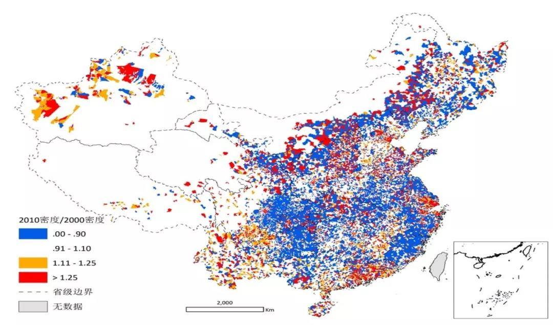 当我们把两张图做了一次对比,那天晚上我就问自己是不是发现了中国的秘密?我们发现的结果是什么——中国有三分之一的国土人口密度在下降,或者是说有一万多个乡镇和街道办事处的人口2000-2010在流失。