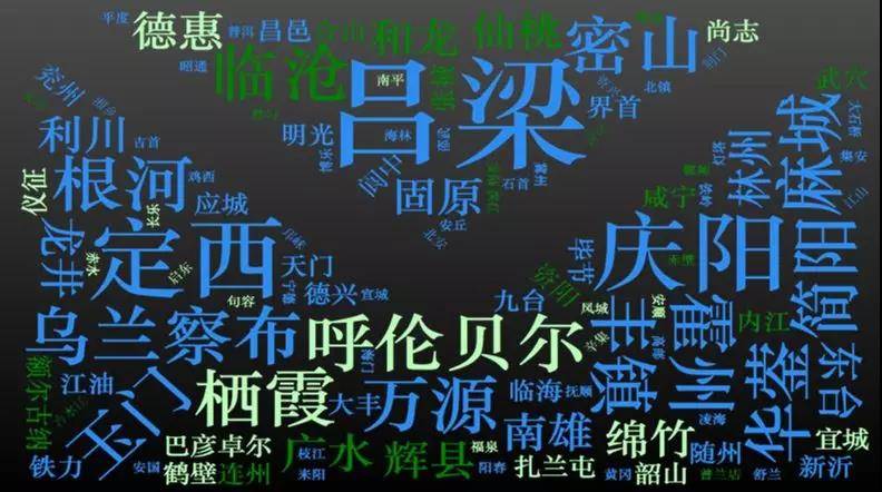 比如说最中间的是吕梁,山西的,原来以矿产资源为主。还有暑假的时候很多人爱好的呼伦贝尔,定西、根河等等一些城市。