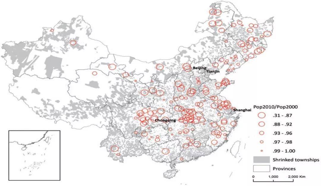 之后我们将中国行政意义上的六百多个城市的市区范围再叠加到刚才那张图上,我们发现中国广大城市中,在2000年到2010年间有180个城市的人口在流失。