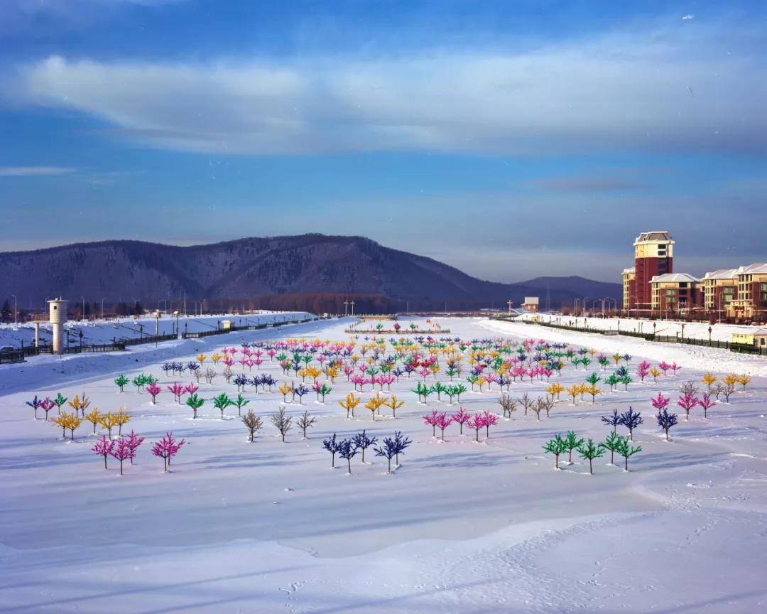 这张照片是我最喜欢的陈荣辉老师的照片:收缩的城市,冰天雪地的伊春,冰冻的河上有这么多彩灯。白天的时候看着也是五颜六色的,晚上那就是五光十色了。这样的一个城市,这样一些塑造出来的人工的繁荣景观,意味无穷。