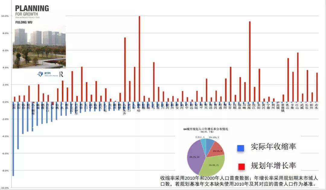 我们的规划还是增长的范式,180个收缩城市中,我们通过公开渠道找到了其中63个城市的总规材料,无一例外地人口都是被预测是增长的。上面的红色表示规划的未来人口增长率,蓝色表示过去几年人口的流失率。