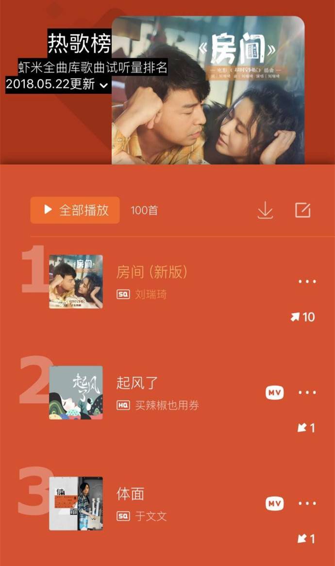 《房间》揽下虾米音乐热歌榜等五个榜单的冠军