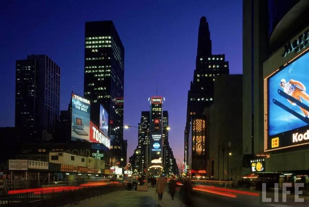 1988 年时代广场两侧的 TOSHIBA 广告牌
