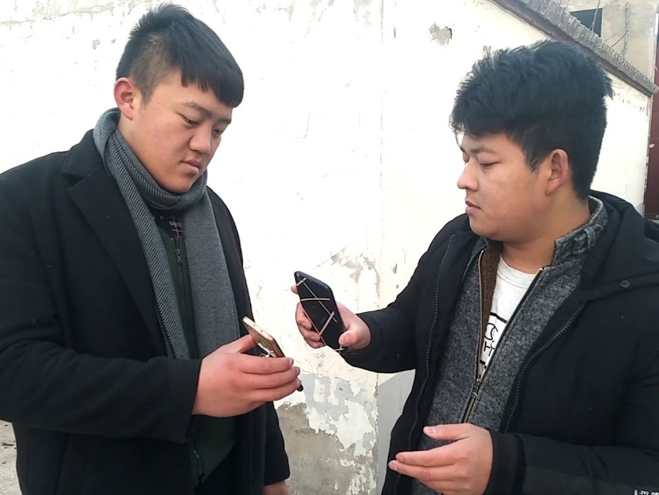 几分钟后,一个背着帆布袋、农民工模样的中年人停了下来,对我们手机表现出兴趣。