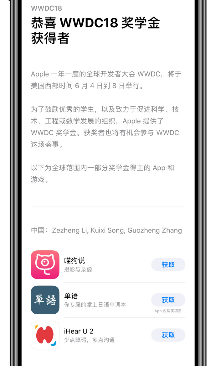 不过要说明的是,虽然 WWDC 界面展示了“单语”这款应用,但实际上并不是靠它拿到苹果奖学金的,这里只是展示出了开发者过去的作品而已。