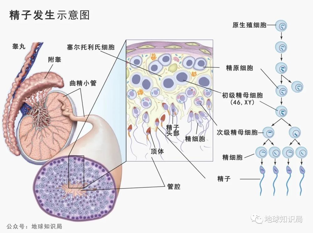 也就是高中生物中的“减数分裂”,一个精原细胞分裂得到四个精子(图:britannica)