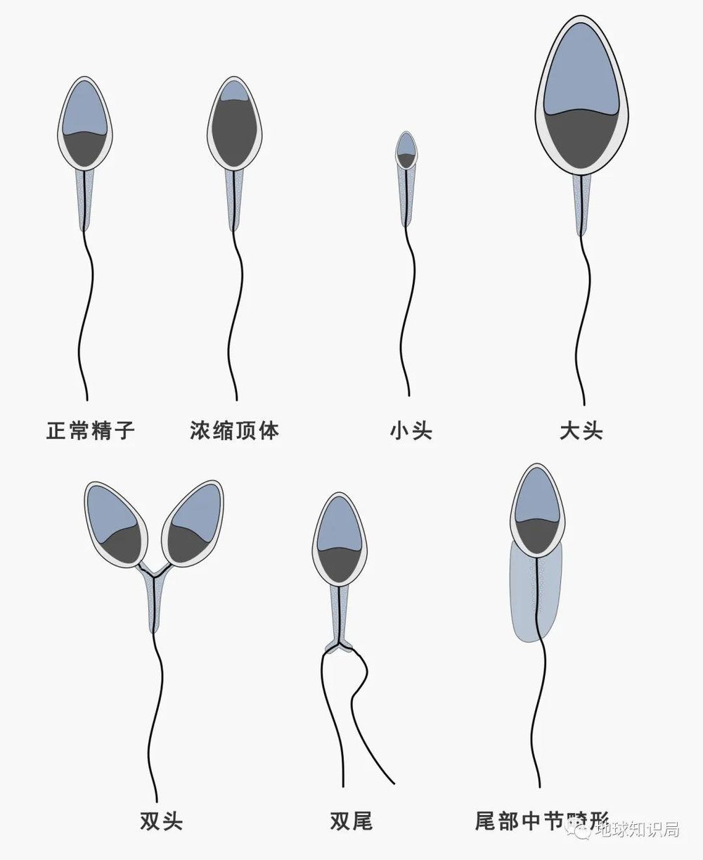 正常人精液中也有一定量的畸形精子,但不会大于20%~40%,畸形精子越多,受精率就越低(图:wiki)