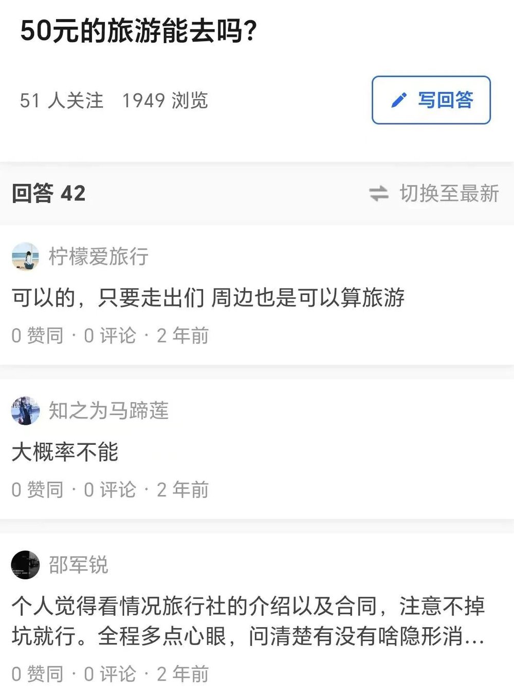 在网上以“50元”、“旅游”作为关键词搜索时,会跳出来很多“靠谱吗”“能去吗”的问题。