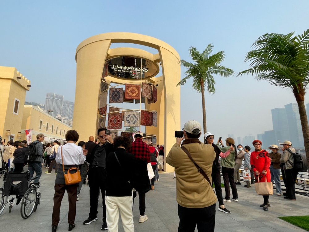 阿拉伯挂毯、播放风光片的大屏幕、沙特小哥都是她们的背景。