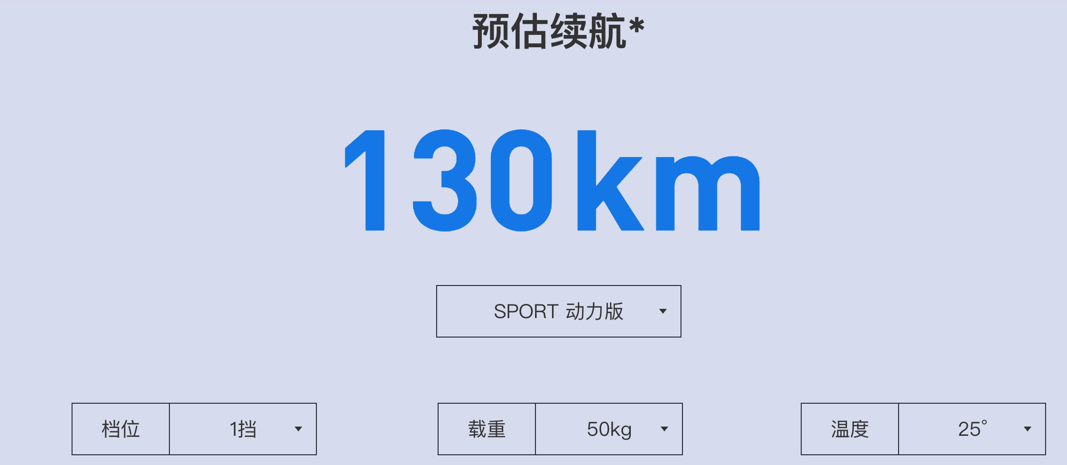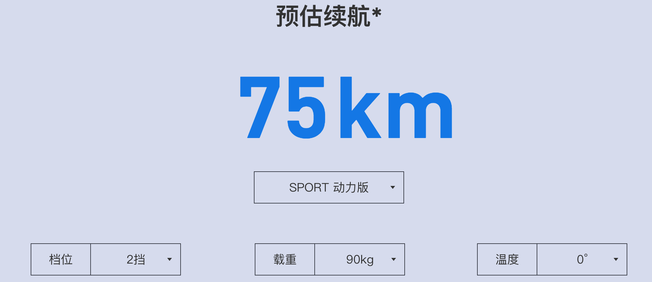 M+的续航方面,官方标称续航最高可达130km,这是SPORT版在速度为1档、载重50kg、温度25度的情况下实现的,当我把参数调到另一种极限,即速度为2档、载重90kg、温度为0度时,显示它的预估续航为75km。