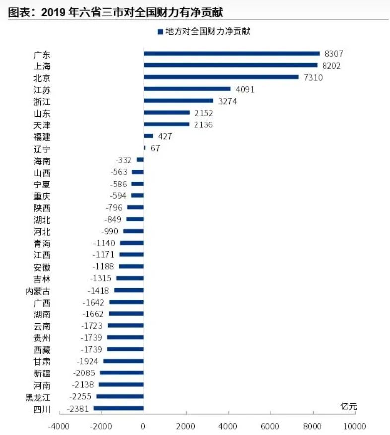 “人”身上积累了最多的要素培养补贴,也是创造GDP税收的主体,代入小王的故事,对比一下各经济圈人口净流动趋势图,以及各省市财政净贡献图(可以近似理解为本地盈余亏空),地方财政不平衡的原因已经呼之欲出。