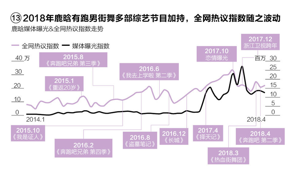 以鹿晗为例,“从这几年鹿晗的热度曲线来看,2017年他成长到生命周期的鼎盛时期,目前有缓慢下滑的趋势。现在他成立了自己的经纪公司,这是他生命周期的重大转折点,看他能否维持热度或尽可能减缓下滑的速度。”王蓓说。