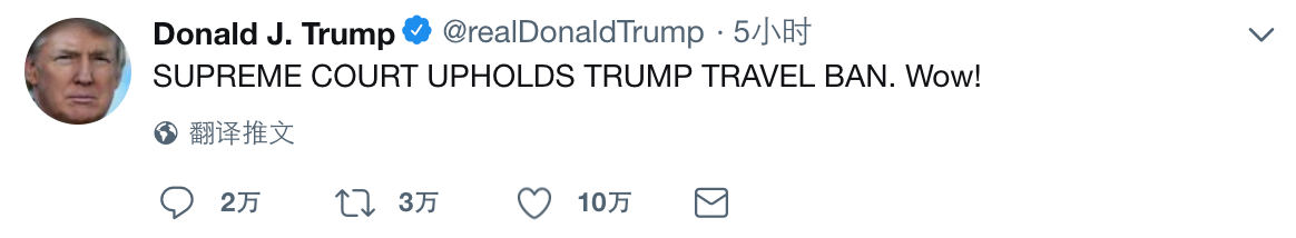 最高法院的支持让特朗普一扫之前的起床气,他在推特上发:Wow!