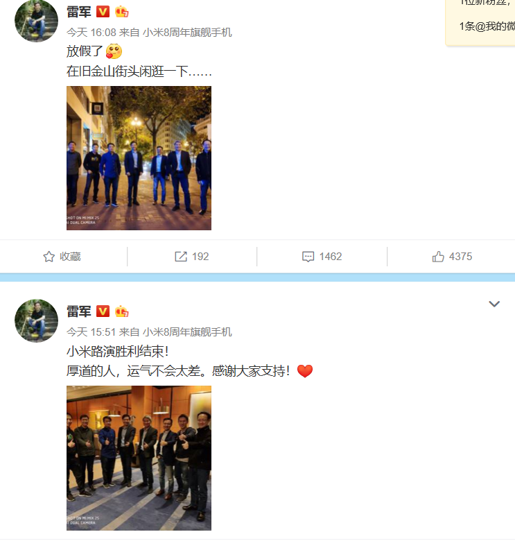 雷军今天很开心,一天发了两个微博,称“放假了”,雷军日常站C位,小米天团了解一下?