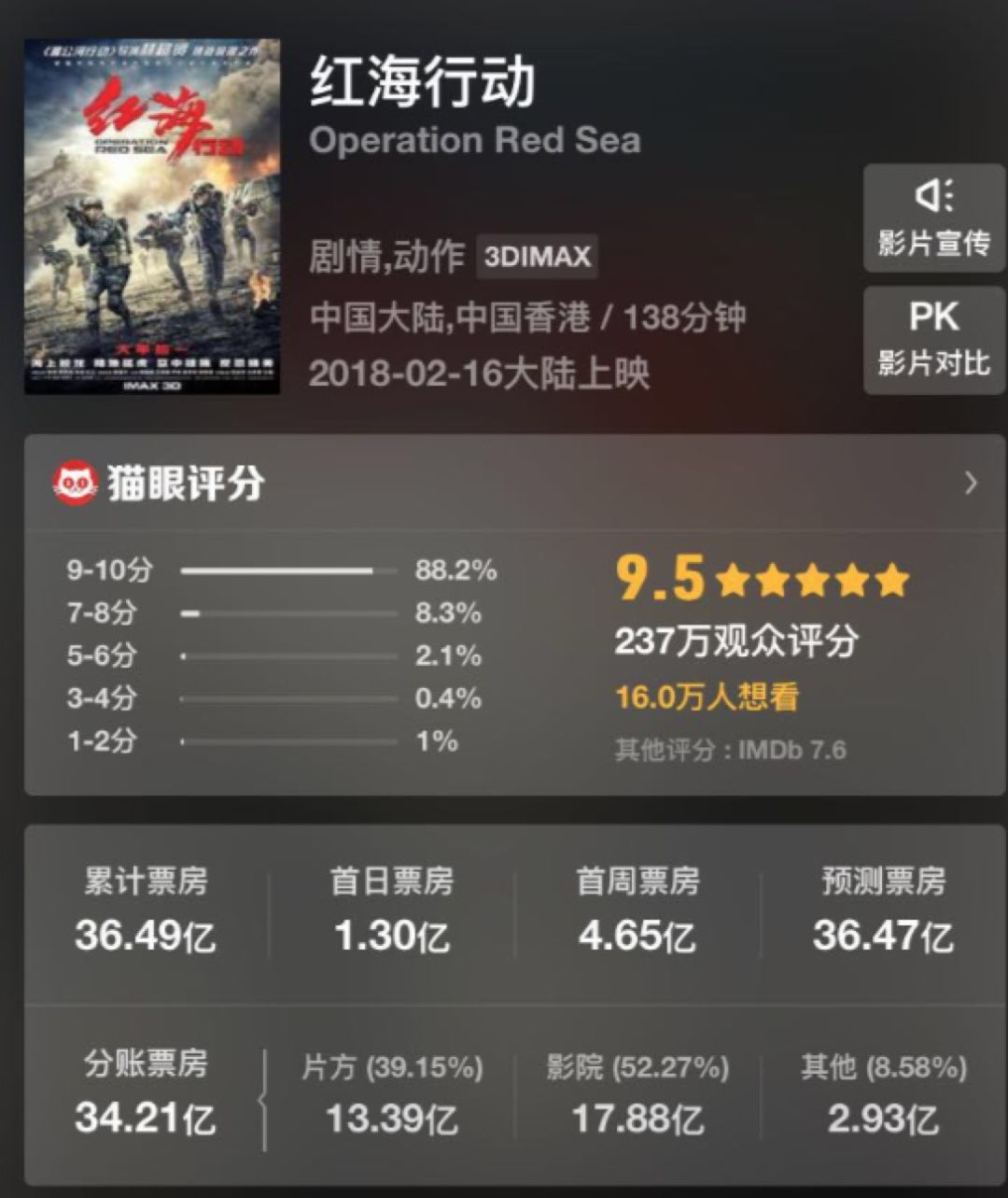 另外,高开也并不会消耗下沉和扩散的能力,该片仍然会做到类似《红海行动》的票房走线。根据猫眼专业版数据,《红海行动》首周票房5亿左右,想看指数也仅仅16万人,但这没有妨碍该片后续凭借口碑和质量拉升票房空间。