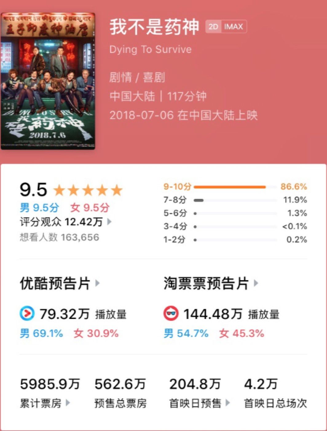 不用怀疑,《我不是药神》点映评分高达9.6分,周日点映上座率甚至达到36%,两日点映票房累积突破5000万,是国产影片点映综合成绩中的最佳之一。所有的数字都指向一个字:爆。