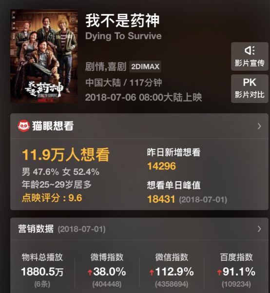 对比《心花路放》《战狼2》,《我不是药神》的影片质量、话题性,包括整合营销、多家公司参与等方面做得是最为完善的。同时影片的主力票务合作方为淘票票,万达影业也是影片重要的联合出品方之一,影片的全案营销也是业内翘楚麦特文化负责的。