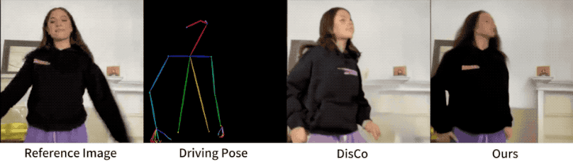 最终,在AnimateAnyone的加持之下,从效果上来看,保证了图像与视频中人物的一致性。
