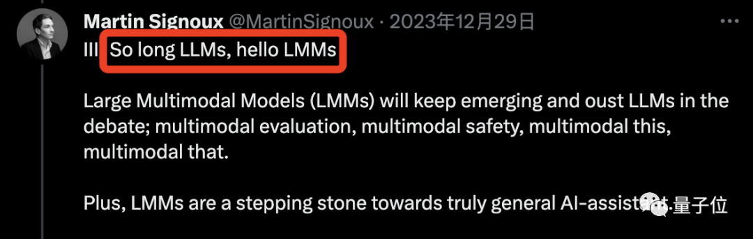 例如Meta研究院Martin Signoux非常直接地表态“再见LLM,你好LMM”,这个预测也得到了LeCun的转发和点赞。