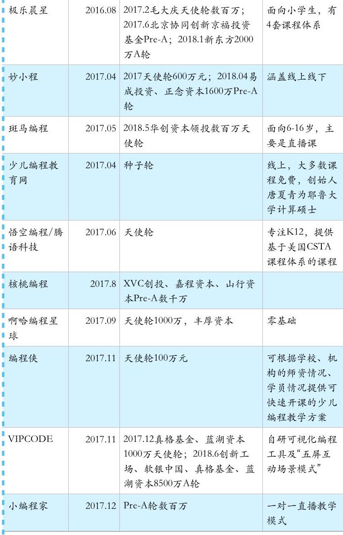 线上的代表公司包括:编程猫、编玩边学、傲梦、VIPCODE。