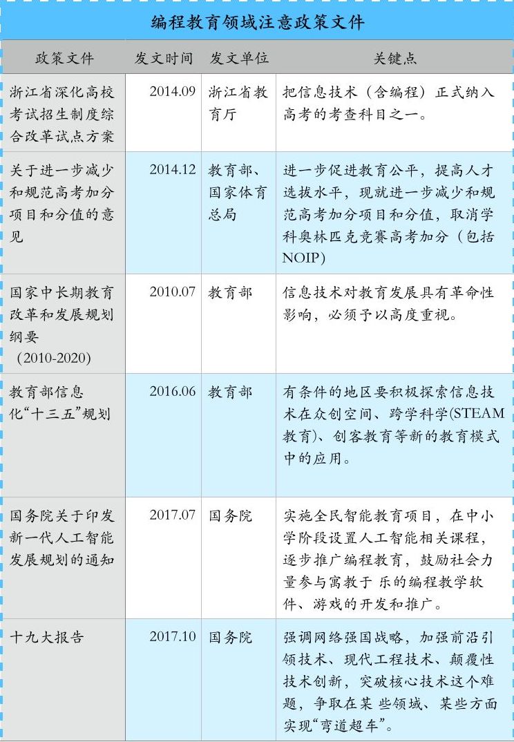 政策层面,从各类文件中确实能读出“编程”正在日益受到重视。特别是一向走在改革前沿的浙江省还把信息技术(含编程)正式纳入了高考考场科目。这不免让人远瞻少儿编程不单单只是课外兴趣教育,更有可能成为K12领域的又一片新沃土,市场前景广阔。
