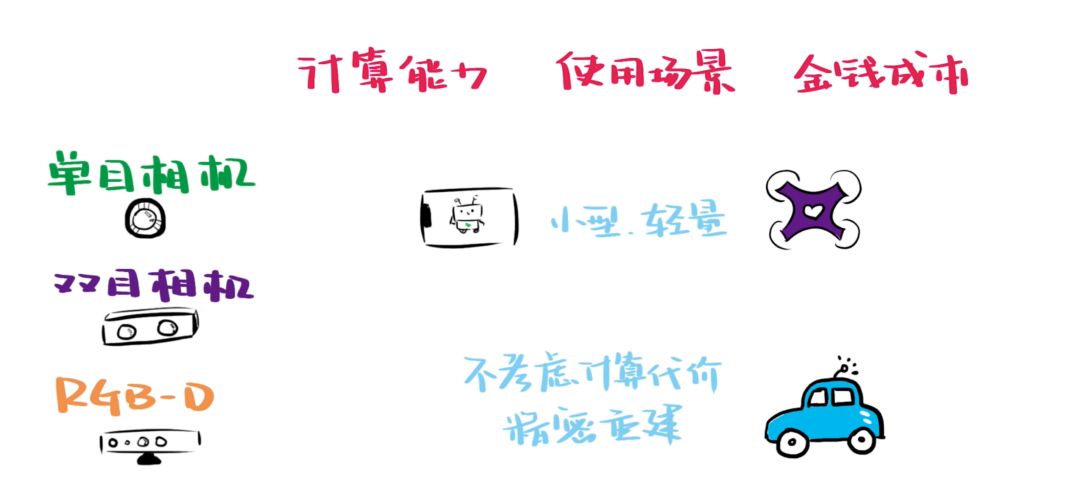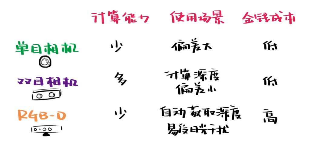 人们会根据使用环境、计算能力和金钱成本等因素,选择不同的 SLAM 方案。单目方案需要的计算资源较少、成本低,但偏差较大;双目方案虽然能估算像素点的深度,但需要大量计算资源;RGB-D 方案虽然自动获取了深度,但视野较小,也容易受到日光干扰。