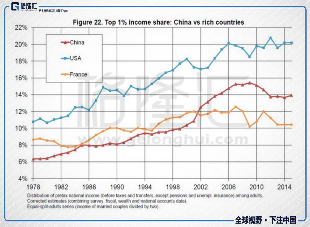 在上图中,Piketty统计了1978~2015年中国前1%人群的收入占比,从1978年的6%,一路上升到了2015年的14%。