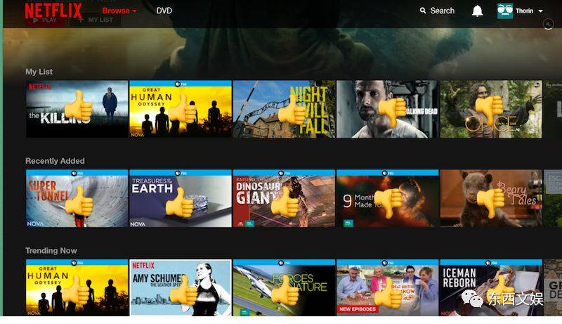 为此,Netflix自去年开始就宣布要革新自身的用户评价体系:2017年4月,Netflix开始采用点赞评分系统(the thumbs system—thumbs up or thumbs down),同时,用户再也看不到一部电影有多少颗星了,而只会看到一个百分比——这个数字代表了用户对Netflix所推荐的内容的喜欢程度。