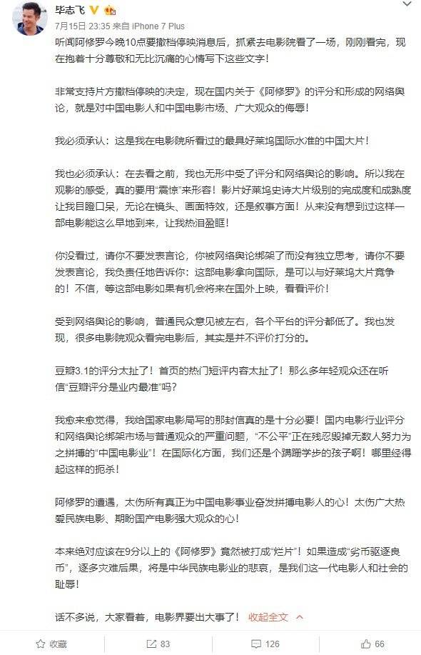不久后,《纯洁心灵·逐梦演艺圈》导演毕志飞在微博上盛赞该片,称《阿修罗》最具好莱坞水准,应该打9分以上,自己十分支持片方撤档停映的决定。你们感受下毕导演的义愤填膺: