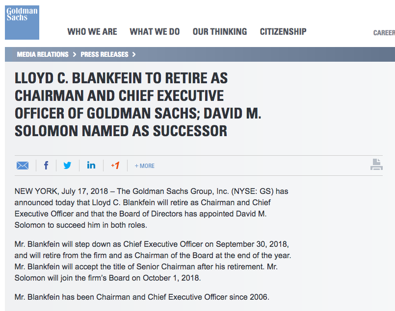 知名投行高盛(Goldman Sachs)于7月17日宣布大卫·索罗门(David Solomon)将于10月1日起担任高盛CEO,接替现任CEO劳埃德·贝兰克梵(Lloyd Blankfein)。贝兰克梵将于2018年9月30日辞去首席执行官一职,并将在年底从高盛退休,卸任董事会主席。而从明年起,索罗门也将接任董事会主席一职。