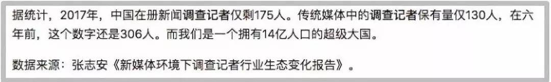 2017年,中国在册新闻调查记者仅剩175人。传统媒体中的调查记者保有量仅仅130人,在6年前,这个数字还是306人。而我们是一个拥有14亿人口的超级大国。