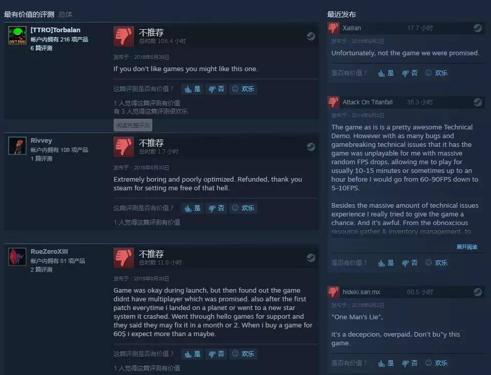 现在《无人深空》在Steam上的评价