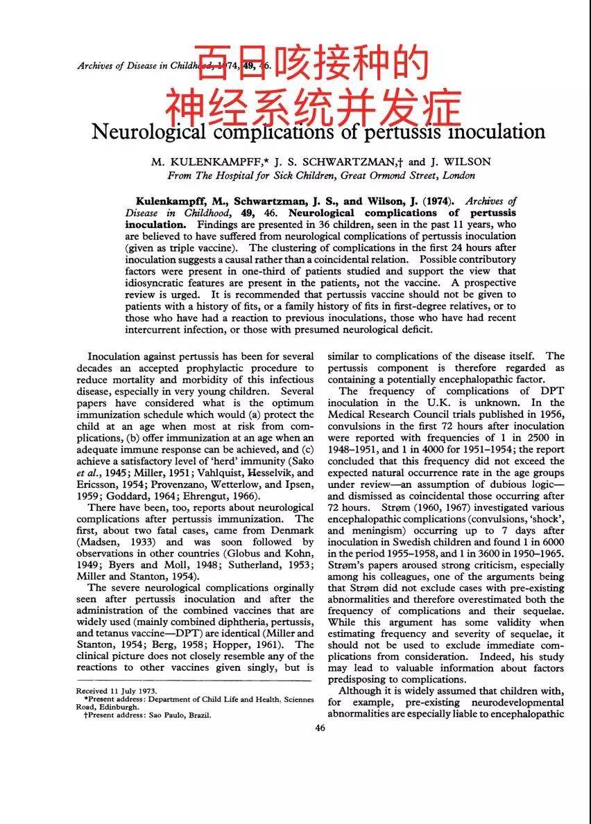 1974 年 1 月,伦敦大奥蒙德街儿童医院医生威尔逊在《英国医学杂志》上发表一份报告,称有 36 名儿童在接种百白破疫苗后发生了脑病。报告一经披露,引起社会巨大反响。