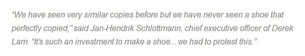 Aquazzura创始人Edgardo Osorio称:“Ivanka Trump Collection推出的凉鞋Hettie几乎复制了他所设计的当红凉鞋款式Wild Thing。”他要求对方赔偿损失费和律师费,且希望法庭颁布禁止Ivanka Trump品牌继续销售Hettie凉鞋的禁令。