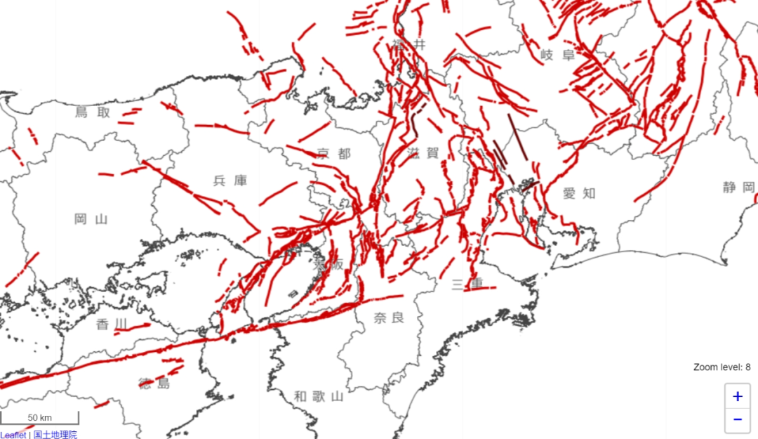 日本国土地理院公开的断层带地图局部
