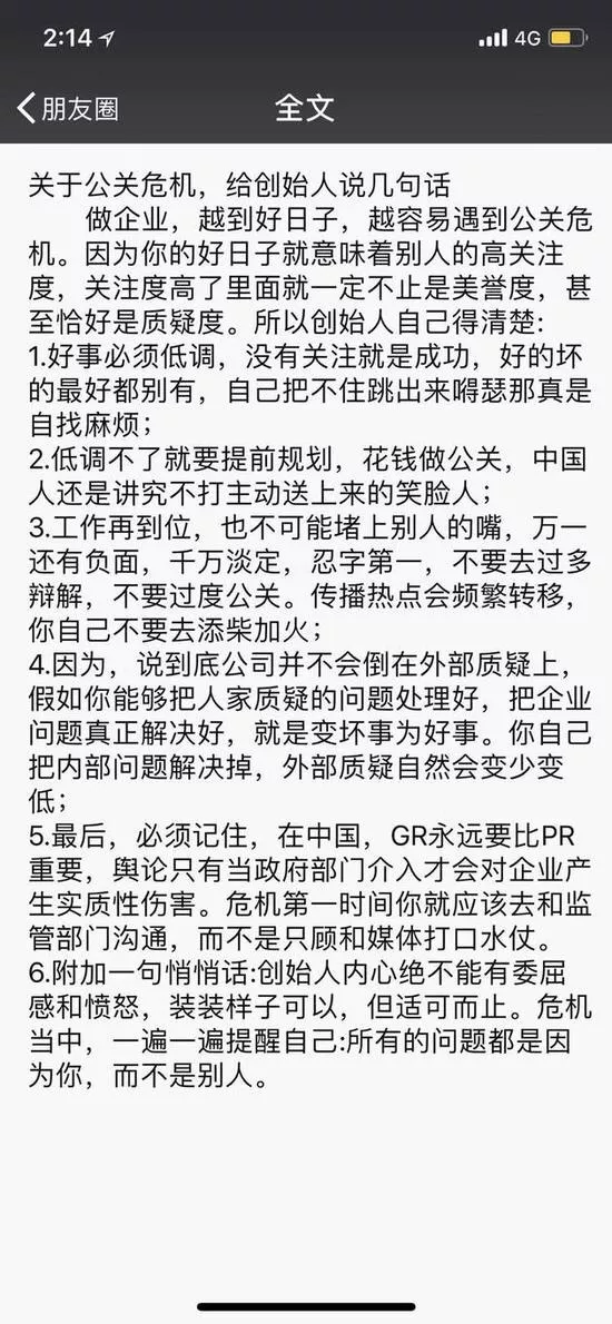 可能也是最近狂飙猛进、继而在高光时刻搞砸名声的创业者太多,圈内知名创业导师牛文文忍不住了,昨天在朋友圈发了篇创始人危机公关指南,其中提到一句“悄悄话”:创始人内心决不能有委屈感和愤怒,装装样子可以,但适可而止。
