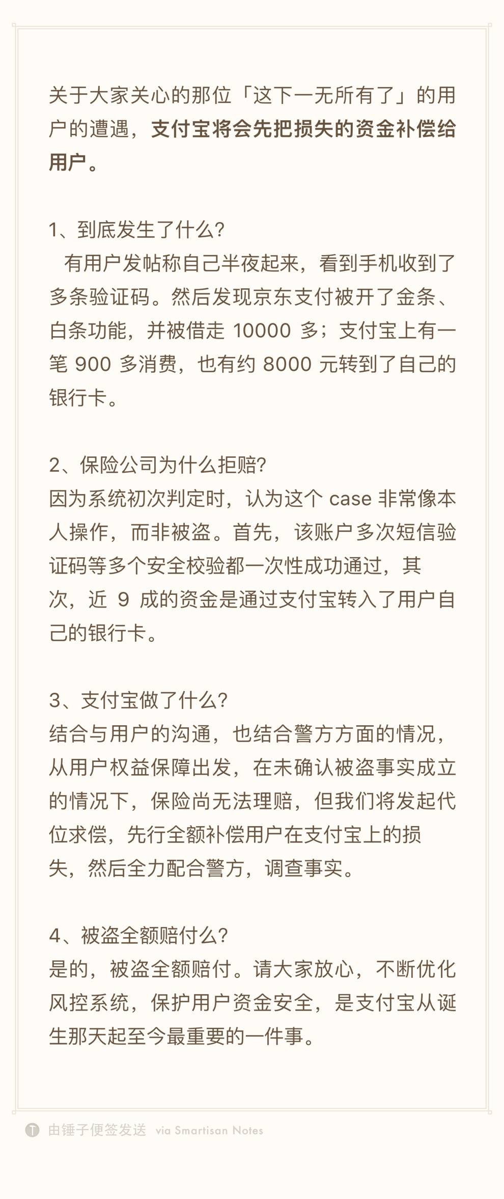 支付宝这边说:“了解到这个事情后,我们昨天凌晨(8月1日,也就是豆瓣帖子发出来的那个凌晨)成立了小组,正在追查这个case,查一查被盗刷原因以及拒赔的理由。”