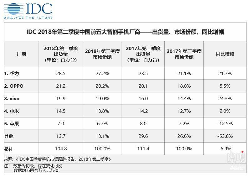 IDC发布手机季度跟踪报告,2018年第二季度,中国智能手机市场出货量约1.05亿台,同比下降5.9%,较上季度降幅有所收窄。华为继续领跑,市场份额也达到历史新高的27.2%,OPPO, vivo分列第二和第三位,出货量同比增长5.5%和24.3%。小米位居第四,出货量同样拥有2.0%的同比正增长。苹果排名第五,出货量同比下滑12.5%。